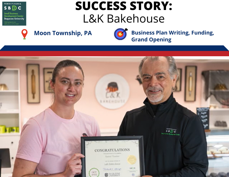 Rachel Thacker, owner of L&K Bakehouse, began her entrepreneurial journey with the Duquesne University Small Business Development Center (SBDC) in January 2024. Like many aspiring business owners, Rachel faced a significant challenge: creating a comprehensive business plan to secure funding for her dream.