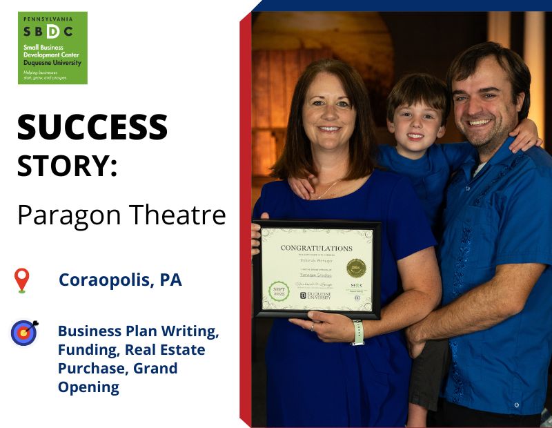 Paragon Theater is now a thriving, independent hub for the arts in Coraopolis, and Duquesne University SBDC wishes Deborah and her family nothing but the best on their Paragon Theatre business journey.